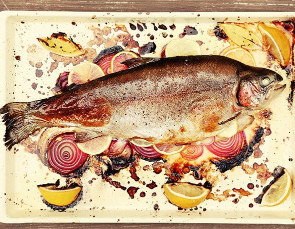 Речная форель с лимоном и красным луком Самое сложное – это найти большую рыбу для горячего, ведь в новогоднюю ночь на стол захочется подать цельное блюдо. Отлично, если у вас в морозилке еще с лета припасен крупный лосось. В противном случае отталкивайтесь от предложения в магазине.