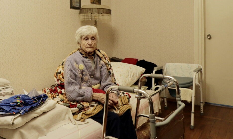 В маленькой кухне окна крест-накрест заклеены белым скотчем. За узким коридором сразу крошечная комната. Клара Ивановна Cоколова сидит на диване. Она в фиолетовом свитере, на котором вышиты белые цветы. Перед ней ходунки. Ей 90 лет.