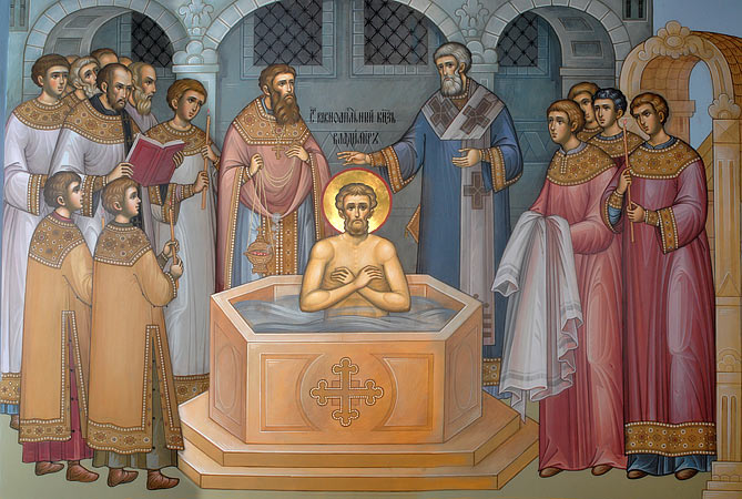 Наступило незабываемое и единственное в русской истории утро Крещения киевлян в водах Днепра. Накануне святой Владимир объявил по городу: «Если кто не придет завтра на реку – богатый или бедный, нищий или раб – будет мне враг». Священное желание святого князя было исполнено беспрекословно: «в одно время вся земля наша восславила Христа со Отцем и Святым Духом».
