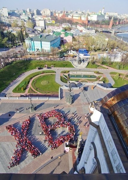 После общего фото главой РПЦ, на восточном стилобате кафедрального храма около 1000 человек выстроились в форме букв «ХВ».