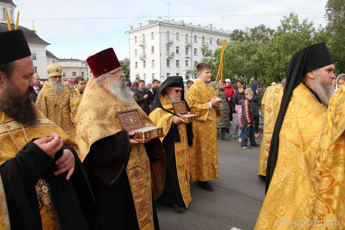 Возглавили крестный ход митрополит Архангельский и Холмогорский Даниил и епископ Нарьян-Марский и Мезенский Иаков.