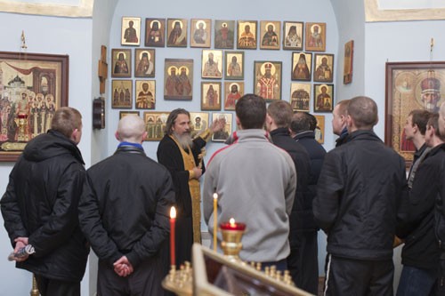 После богослужения о. Константин подводит заключенных к иконам бутырских святых и рассказывает о новомучениках, освятивших своим присутствием тюремные стены