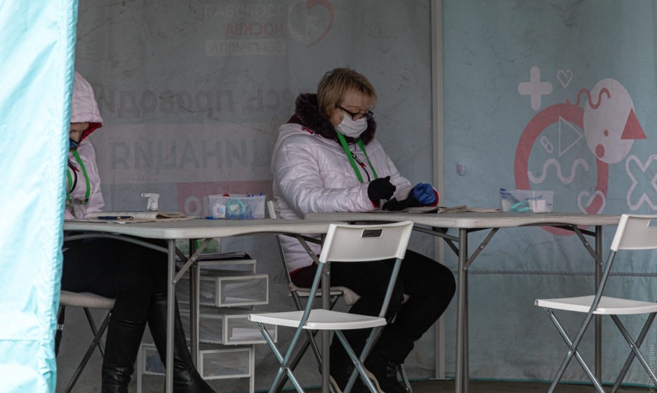 Перчатки не надеваю, смотрю, что будет. Ахмад не настаивает, паспорт не спрашивает, женщину, которая меня прислала, он не знает. Делаю вывод, что стать волонтером «Здоровой Москвы» может любой, кто выдаст примерно такой набор слов: «вакцинация», «волонтер», «прислали», «какой-то социальный центр». Но хоть легально, хоть подпольно — желающих сидеть в хлипком шатре у метро мало.