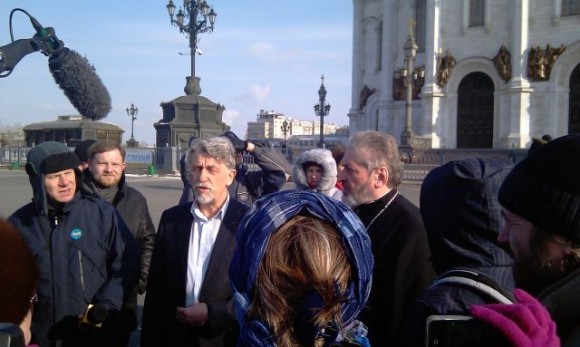 «Люди пришли, храм оказался на замке, на нем висела табличка, что храм сегодня закрыт для посетителей по техническим причинам, рядом стоял ОМОН. Когда пришедшие увидели, что храм закрыт, с ними начали препираться провокаторы, затем они устроили потасовку, облили одного парня водой. Когда он обратился к сотрудникам милиции с вопросом, почему они не реагируют, ему предложили пройти написать заявление в полицейском автобусе, после отказа пройти в автобус его задержали», – рассказал адвокат (Николай Полозов – прим.ред)