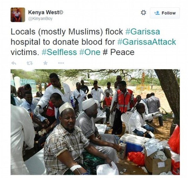 Местные жители активно сдают кровь для пострадавших в результате теракта. Команда кенийского Красного Креста попросила добровольцев сдавать больше крови. Очень активно сдают кровь мусульмане, сообщают очевидцы в Инстаграмме.
