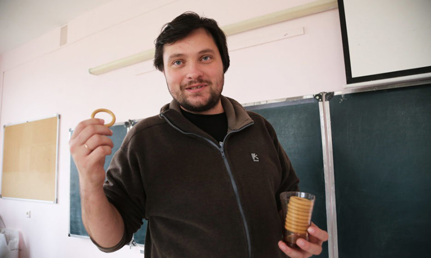 Дмитрий Славин по образованию физик, но преподает географию. Он сам поднимался в горы, спускался в пещеры, плавал в Индийском океане, где у берега полно акул, и смотрел, как Рио-Негро сливается с Амазонкой. Эти истории он рассказывает детям — вместе с рассказами о первой кругосветной экспедиции, самых высоких горах мира и резиновых птичках, уже 30 лет распространяющихся по всему мировому океану. Дмитрий Славин считает, что так дети лучше запомнят географию.