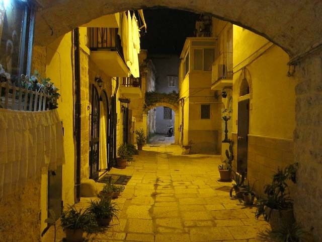 Тепло и bello. Вверх по витому балкончику карабкается Санта Клаус в красных пижамных штанишках, на витринах рассыпались бумажные звезды, склонились над пустой колыбелькой цветные фигурки… Не прогнал декабрь жителей Бари с улочек, для большей близости скрепленных круглыми арками, узеньких, каменных, похожих на коридоры коммунальных квартир.