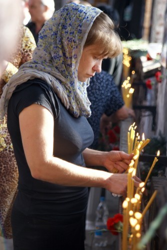 К подножию столичного памятника, установленного на площади перед храмом Рождества Пресвятой Богородицы на Кулишках, все эти три дня москвичи несут цветы и свечи.