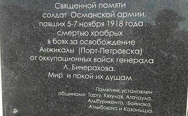 «Священной памяти солдат Османской армии, павших 5-8 ноября 1918 смертью храбрых в боях за освобождение Анжи-Калы (Порт-Петровска) от оккупационных войск генерала Л. Бичерахова. Мир и покой их душам», – написано на плитах.