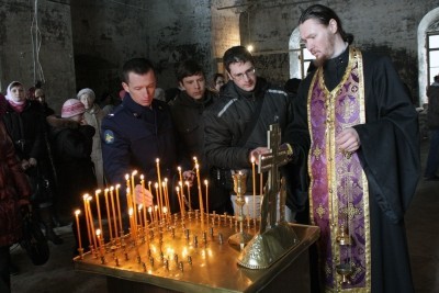 В возрождающемся храме прошла панихида о погибших. Служил настоятель Свято-Андреевского прихода деревни Новоселово протоиерей Андрей Зацепин.