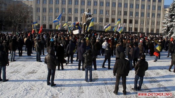 В Житомире около пяти сотен человек пикетируют здание облгосадиминстрации, где 23 января начала работу сессия облсовета. Люди пришли мирно выразить свой протест. Они требовали от депутатов принять обращение об отмене законов, принятых Верховной Радой 16 января, и отставку правительства и президента.