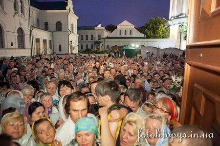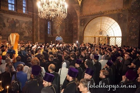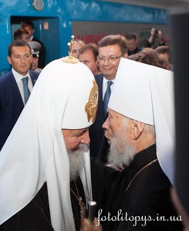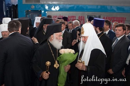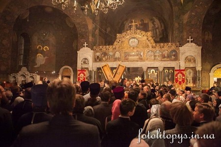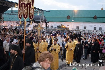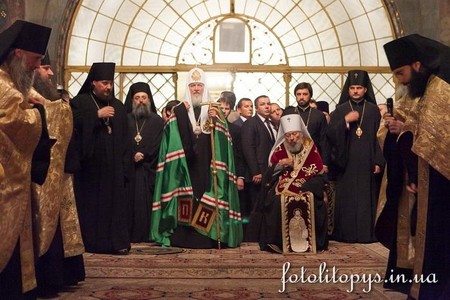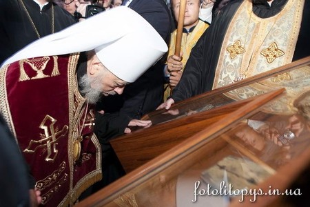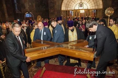 У Святых врат Киево-Печерской Лавры Крест апостола Андрея Первозванного и Святейшего Патриарха Кирилла встретили Блаженнейший Митрополит Киевский и всея Украины Владимир, епископат и духовенство Украинской Православной Церкви и множество верующих. Святыня была перенесена в Трапезный храм во имя преподобных Антония и Феодосия Печерских, где Святейший Патриарх Кирилл и Блаженнейший Митрополит Владимир совершили молебен.