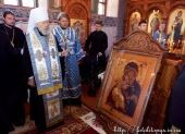 Под песнопения в честь Пресвятой Богородицы архиепископ Переяслав-Хмельницкий и Вишневский Александр и губернатор Киевской области А.И. Присяжнюк внесли образ в храм, где Предстоятель Украинской Православной Церкви совершил перед ним молебен.