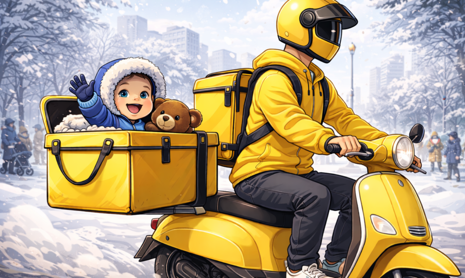 На записи видно, что мужчина в желтой форме сервиса доставки продуктов подъезжает на скутере к торговому центру. После чего достает маленького ребенка из термосумки, закрепленной на багажнике. Следом подъезжает другой мужчина и вынимает из такой же сумки девочку.
