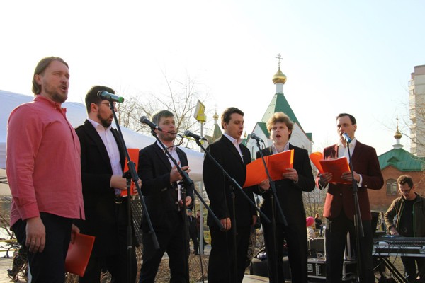 Божественная литургия в день Воскресения Христова в храме всех святых в земле Российской просиявших Помимо традиционных духовных песнопений, в преддверии празднования Дня Победы хор исполнил песни военных лет Праздник посетили более тысячи человек