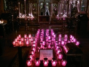 В форме креста в храме расставили столы, на которые молящиеся поставили свечи в красных стаканах. Служили при погашенном свете.