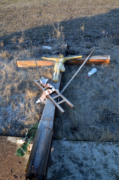 Поклонный крест на границе Первомайского и Арбузинского районов был повален, полит жидкостью для розжига и подожжён.