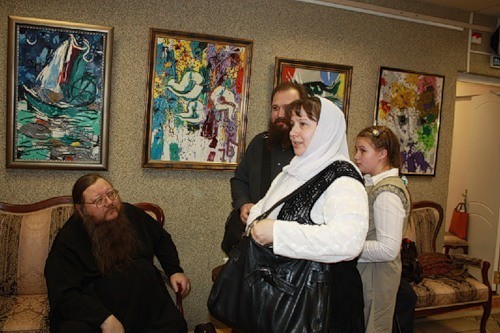 В Выставочном зале «Ростокино» Мария Тихонова познакомила гостей с выставленными здесь произведениями участников изобразительного форума. Представляют интерес копии старинных фресок из Сербии, деревянные скульптуры В. Барабанова, передающие христианскую символику, живописные иконы Валентины Доценко «Иоанн Предтеча», «Апостол Павел», «Андрей Первозванный». Фотографии деревянных церквей Севера России привезены сюда для того, чтобы мы обратили внимание на ту красоту, которую имеем. «Пока мы не восстановим то, что есть, – говорит М. Тихонова, – двигаться дальше мы не сможем». Живопись матушки Татьяны Юшмановой: «Апрельское солнце», «Первая зелень» и многие другие этюды и портреты раскрывают перед зрителем глубинную Русь и выводят, казалось бы, канувшие в Лету образы крестьянина – труженика и молитвенника.