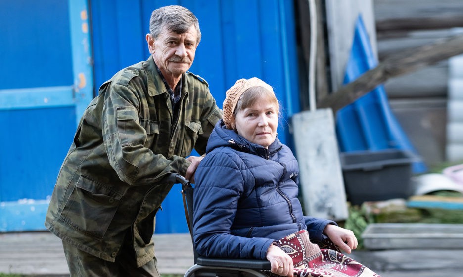 Валентина Владимировна, опираясь одной рукой на ходунки, а другой на мужа, поднимается с инвалидной коляски. Пытается сделать шаг вперед.