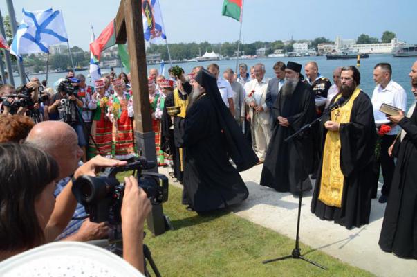 На месте установки креста были построены роты почетного караула от Черноморского флота России и Военно-морских сил Вооруженных Сил Украины, торжественно подняли Государственные флаги России, Украины и Беларуси, а военные оркестры ЧФ и ВМСУ исполнили гимны.