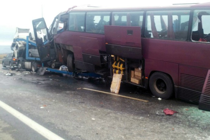 В автобусе, который ехал из Москвы в Ереван, находились 52 человека. Во время движения машина заскочила на стоящий на обочине автопоезд. В результате передняя часть автобуса была полностью смята, железные балки автопоезда протаранили кабину, где находились два водителя.