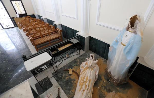 Храмы города в полуразрушенном состоянии после ухода повстанцев. Исламисты не только обстреливали здания церквей, но также уродовали статуи и иконы, сообщает Седмица со ссылкой на агентство Al-Akhbar.