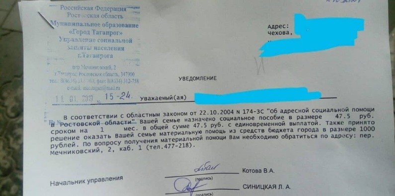 В Таганроге многодетной семье назначили пособие в 47 рублей