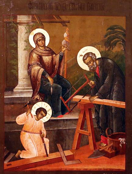В руках у Иосифа – сверло, топор и циркуль. Те же орудия ремесла и в руках у Христа-отрока, а затем — юноши. На его руках мозоли предваряют раны от гвоздей, и пот с чела Он вытирает привычным жестом. Помним ли мы это?