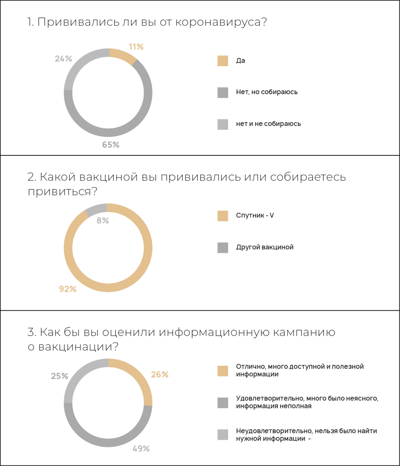 Возможно, причиной этого является недостаточный уровень информированности населения о вакцинации против коронавируса. Только 26% опрошенных полностью положительно оценили информационную кампанию о вакцинации, отметив обилие и доступность полезной информации. 25% назвали кампанию удовлетворительной, указав на имеющиеся неясности и неполную информацию. А 49% не удовлетворены информированием, заявив, что нельзя было найти нужной им информации.