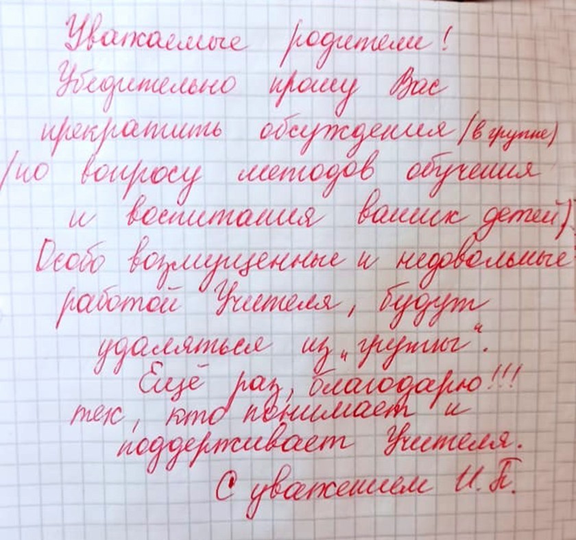 На следующий день Инна Петровна написала текст на листочке, это сфотографировал кто-то из родителей и прислал в группу: «Уважаемые родители! Убедительно прошу Вас прекратить обсуждение (в группе) по вопросу методов обучения и воспитания ваших детей. Особо возмущенные и недовольные работой Учителя будут удаляться из группы. Еще раз благодарю!!! тех, кто понимает и поддерживает Учителя. С уважением И.П.».