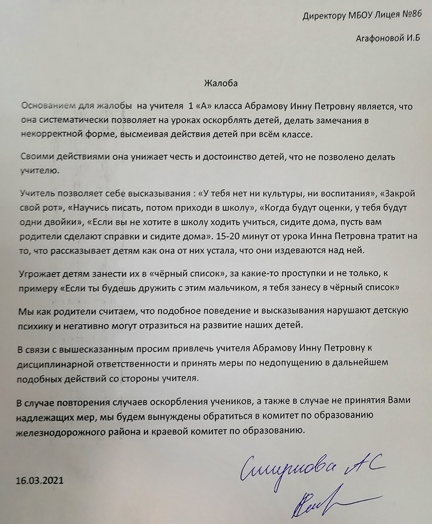 — Я ухожу домой, дозваниваюсь до завуча, доношу всю эту информацию, и она мне говорит: «Я побеседовала с Инной Петровной. Она признала этот факт. Мы примем меры». Но ничего не изменилось, — вспоминает Елена. — Далее в группе [родителей в WhatsApp] стали писать, что один ребенок жалуется, второй. И я поставила вопрос: «Всех устраивает, как учитель общается с детьми?»