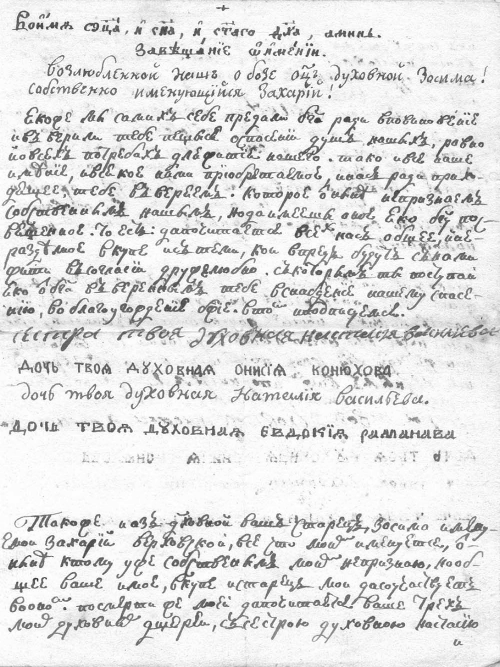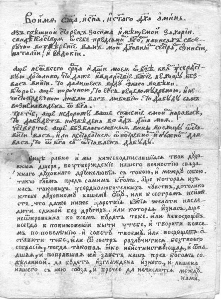 азъ грншной старнцъ и дрггъ вашъ д[у]ховной паче же недостойной рабъ вашъ именем Захарїи зовомой Зосима тако пред Самим Б[о]гом безначалным О[т]цем, и собезначалным Его Единородным С[ы]ном, и прес[вя]тым и животворПщым Д[у]хом завнщаю самаго себе и МбнщаюсП В д[у]ши моеП. Аще вы таковыми пкоже нынн со мною и мнждг собою в дргжелюбїи имеетесП и такожде какъ нынн покорны и послгшны мнн бгдете всегда и во всем чистосердечно в точности Вкровнн<н>ы, то аще // сицн пребгдите во всю вашг жизнь, то ежели В Б[о]га помилованъ бгдг, и сподоблюсП участи угодившыхъ Б[о]гг, тогда, ежели Б[о]гъ бла<го>волит, непременно по сему завнщанїю постгплю и выполню. То есть: молити бгдг Б[о]га, да первне васъ сподобитъ вечнаго блаженства, а потомъ да причтетъ и мене к вамъ.