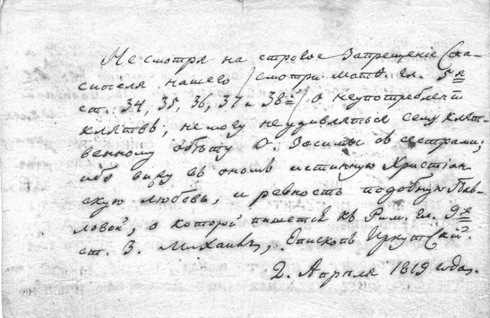 Несмотря10 на строгое запрещение Спасителя нашего (смотри Матф. гл. 5я ст. 34, 35, 36, 37 и 38й) о неупотреблении клятв, не могу не удивляться сему клятвенному обету О<тца> Зосимы с сестрами; ибо вижу в оном истинную Христианскую любовь и ревность, подобную Павловой, о которой пишется к Рим<лянам,> гл. 9я ст. 3. Михаил, Епископ Иркутский.