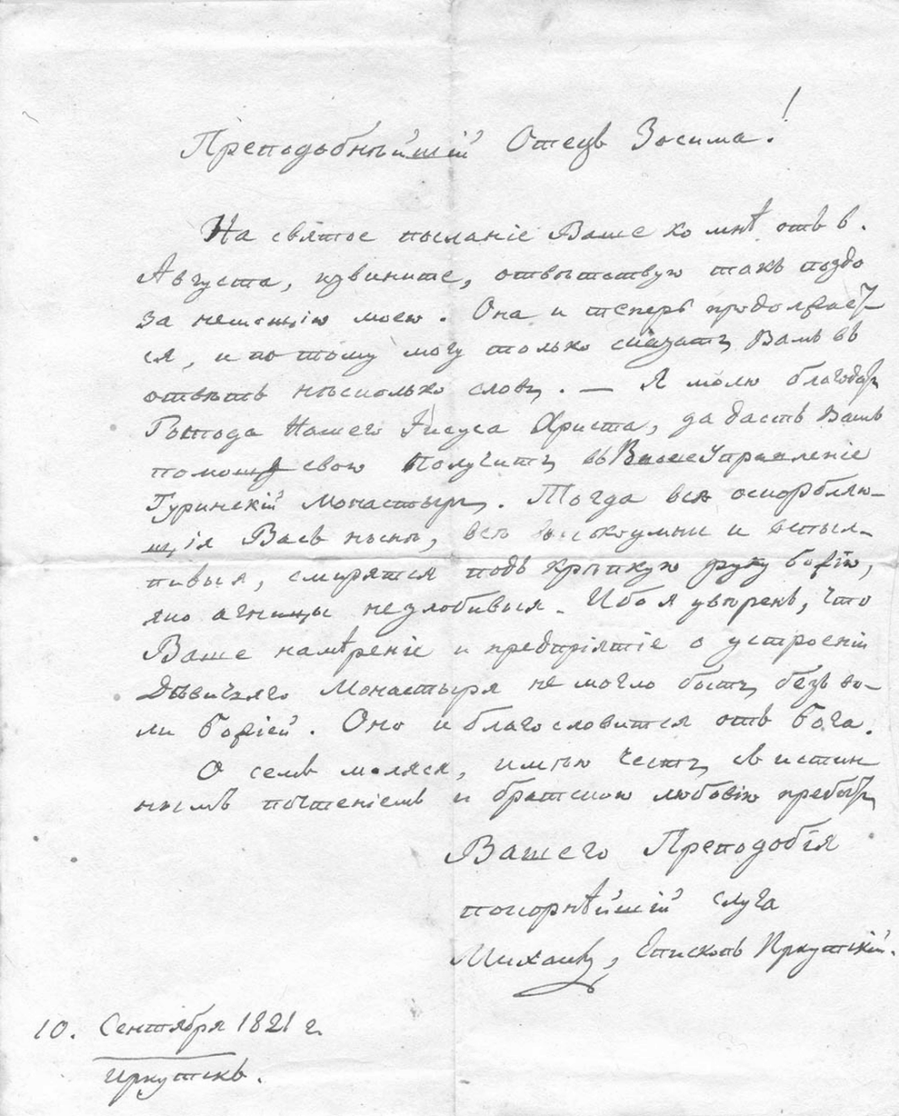 Еще не успел я ответствовать на писание Ваше от 27 Июля, как получил от Вас и другое сего Октября 17 дня. То и другое содержат в себе такие известия, кои приятны не только слуху моему, но и сердцу. Да поможет Вам Пастырь и Поспешитель душ наших, Иисус Христос довести до спасения всех, предавшихся и предающихся Духовно-Братственному Вашему водительству! — Хотя же в первом письме Вы требовали от меня некоторых советов касательно монашества: но по всему вижу, что оные Вам не нужны. Дух, виденный в Вашей книге, дух разума и благочестия, утвержденных навыком и опытностию, сей дух един доволен Вам к разрешению всех недоумений и сомнений. // Сочинение сие Ваше, хотя недовольно много мною читанное, показалось мнестоль совершенным в своем роде, что я не усомнился бы подать свой голос о напечатании его. С прискорбием духа расстаюсь с оным, и посылаю его при сем по желанию Вашему. Но буду с радостию ожидать присылки другого Вашего сочинения, мне обещанного, так как и благосклонного известия о всем, случающемся с Вами21. Всесильный да сохранит Вас и братию Вашу от всех навет вражиих, сего всеискренне желает Вам Михаил, Епископ Иркутский.