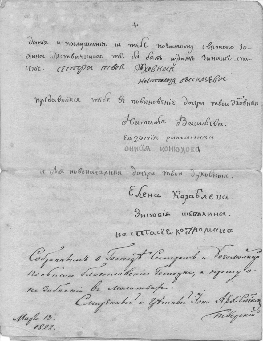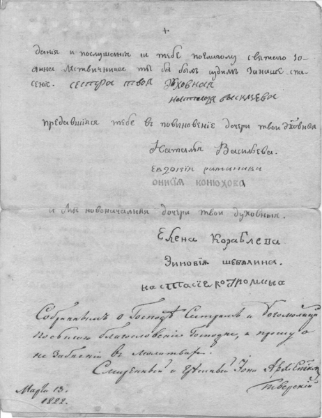 26Верх листа, на котором написано это письмо, оторван. На обороте было письмо преподобного Зосимы, от которого сохранилась подпись и дата: 1820 марта 1. числа, а также — письмо сестер — рукой Натальи Васильевой, скорописью, подписи — автографы сестер.