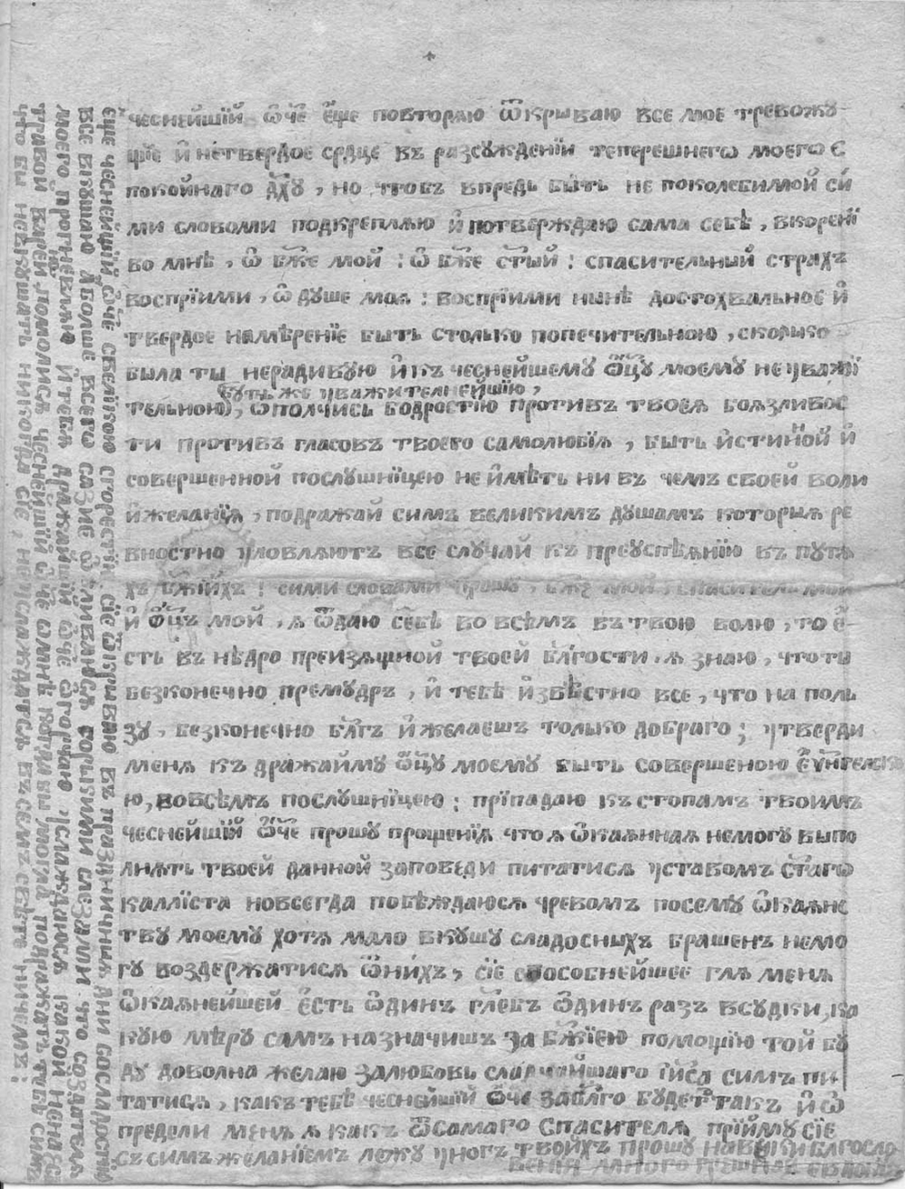 На любезное мне писание Ваше от 23 д<ня> Февраля не могу по настоящим великим дням много писать Вам в ответ, разветолько следующее: — 1е Что я мыслю о Вашем Духовном Завете с сестрами, о том кратко написал на оном мнение мое, не для охуждения оного (Боже сохрани меня от сего зла!), но для уверения Вас в искренности моих чувствований в рассуждении Вас. — 2е Согрешил я, признаюсь, противу Вашей заповеди о непоказывании никому вышепомянутого завета. Ибо я давал оное для прочтения вместес Вашим письмом здешней Игумении Нимфодоре; бывшей Капитанше Кругловой. Плод от сего чтения ее вышел тот один, что обеих сестр Ваших, Наталию и Евдокию она по догадкам считает себе родственницами. — 3е Чем лечить болящую Сестру Вашу Евдокию, о том с совету Врачей конечно можно бы было дать наставление: но, судя по вере ее и полному упованию на промысл Божий, мню лучше оставить // ее на волю оного: пусть, по Апостолу, внешний ее человек тлеет, лишь бы внутренний обновлялся по вся дни (ср. 2 Кор 4:16). — 4е О будущем, преднамереваемом Вами переезде в здешнюю страну, или о временной только поездке Вашей сюда, Сам Бог подаст Вам случай. — 5е Ответы Ваши в Барнаул благоразумны: но я люблю при всяком подобном случае напоминать Христовы словеса: бдите и молитеся, да не внидете в напасть (Мф 26:41; Мк 14:38)22.