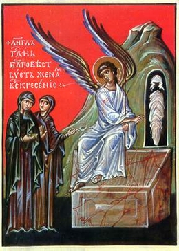 Этот икос рисует нам картину всего мироздания: земля колеблется, море бежит, светила поколебались, ад уже боится своего поражения, а иудеи еще думают, какую бы им хитрость против этой мощи предпринять, и особое место в этих текстах занимает образ жен-мироносиц. Они вспоминаются в субботу, потому что пошли ко гробу, как только это стало возможно, чуть только рассвело, на грани этих дней — субботы и грядущего воскресенья. И победным гимном в этих текстах звучит рассказ о них, о тех, чья любовь и верность не знает преград: «Жены же взывают: сия суббота есть преблагословенная», — это их день, день их непосрамленной веры и верности.