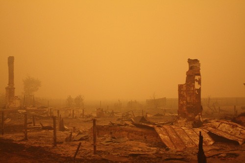 Мы были на месте пожара спустя две недели. Выжженное черное поле и разбросанные по нему печки. Похоже на кадры военной хроники: «Фашист пролетел». Вдоль дороги таблички с фамилиями бывших домовладельцев, а теперь собственников пепелищ. Пять узбеков роют ямки: строят забор.