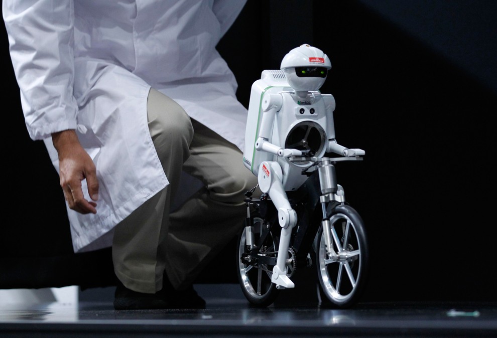 Робот-велосипедист на выставке электроники. Япония, 2011 год
