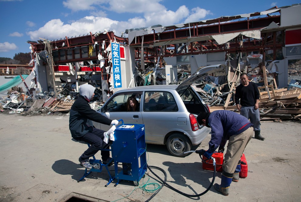 Велосипед-насос на разрушенной землетрясением заправочной станции, Япония