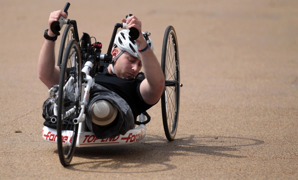 Велосипедист с ампутированными ногами. Англия, 2012 год