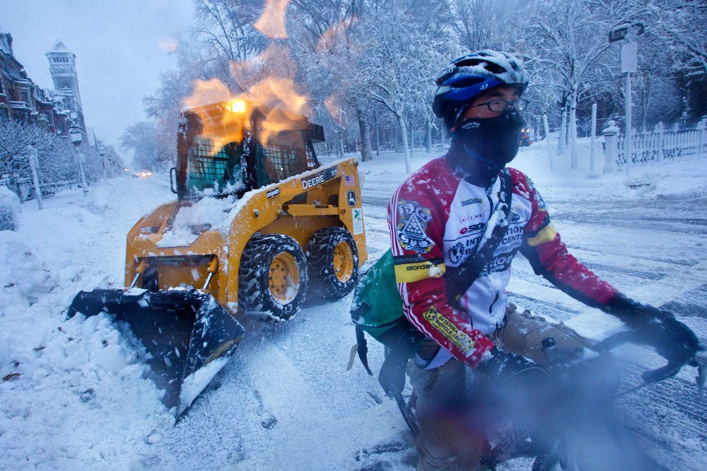 Сильная метель не помешала велосипедной прогулке Марвина Вэнга. Бостон, 2011 год