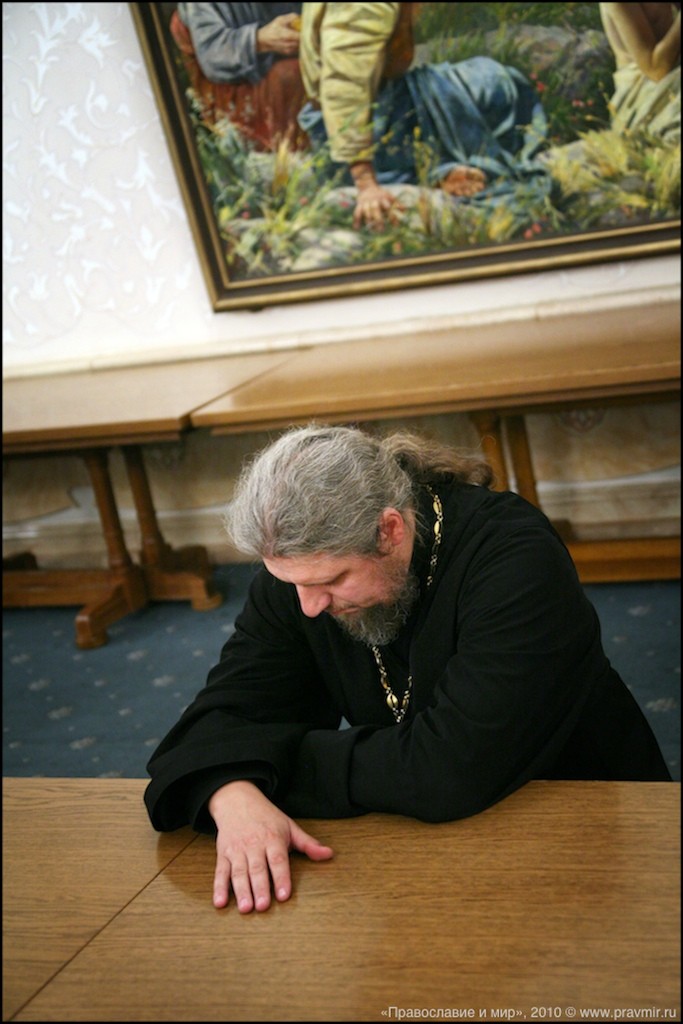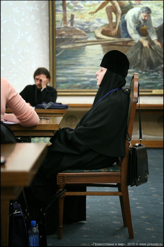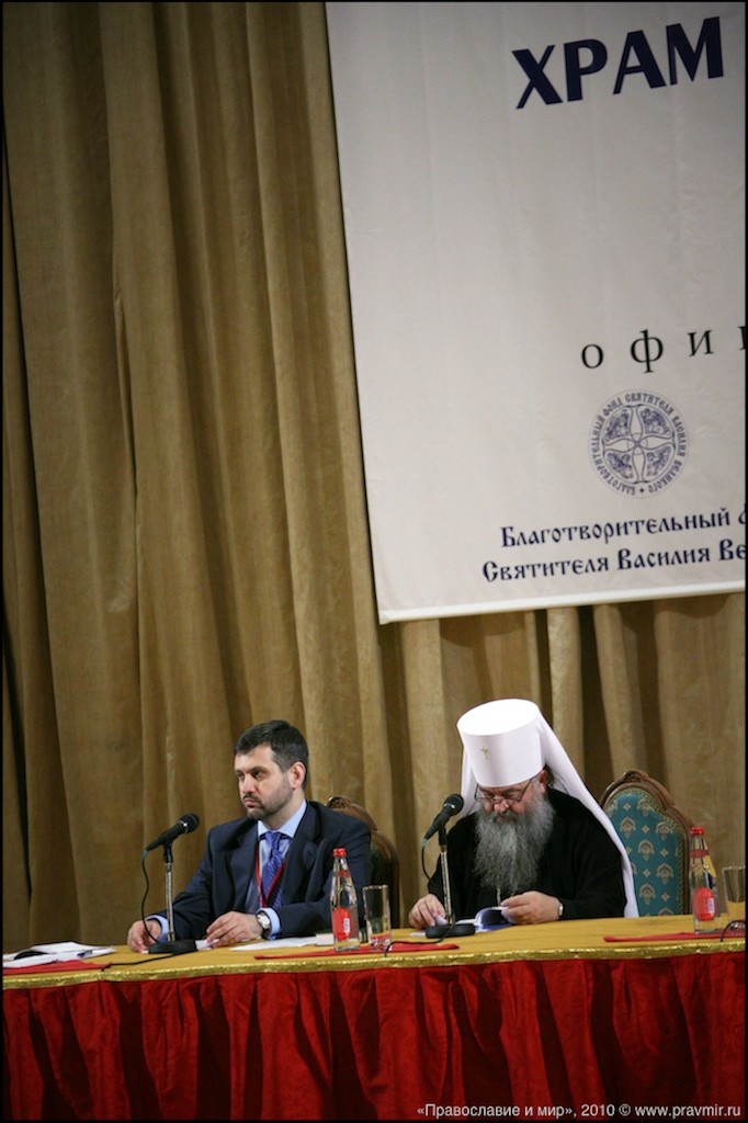 Перед открытием пленарного заседания. В центре — прот. Георгий Коваленко, игумен Савва (Тутунов), В.Р. Легойда, митрополит Саранский и Мордовский Варсонофий, управляющий делами Московской Патриархии.