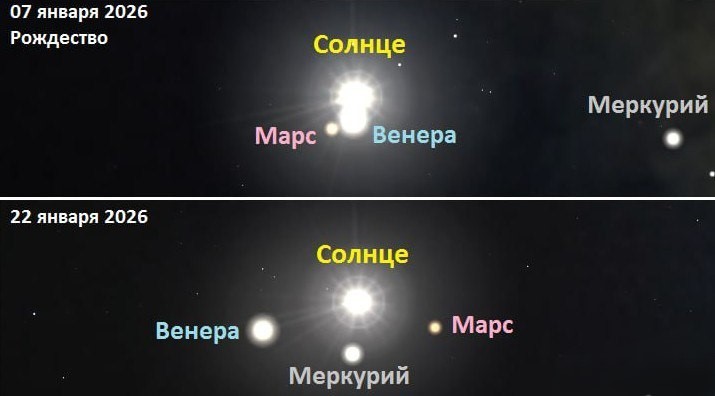 Кульминация наступит 22 января, когда три планеты образуют с Солнцем почти ромбовидную фигуру. После этого построение быстро распадется: сначала отойдет Меркурий, затем Венера и Марс.