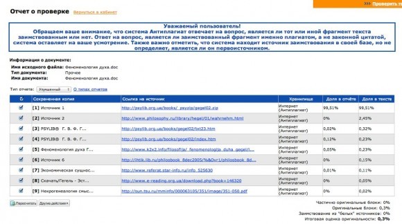 Только что я продемонстрировал это в Фейсбуке, пропустив работу Гегеля «Феноменология Духа» через «Антиплагиат». Результат по памяти таков: 0,03 самостоятельности. Все остальное — заимствования. Такой результат даст программа, если вы не подписаны на дополнительные услуги. Кстати, услуги, связанные с использованием библиотек, с моей точки зрения, здесь стали гораздо хуже. Если вы подпишитесь, например, за 700 рублей на месяц, или 22000 рублей на год (что весьма немало), то вы сможете просмотреть источники «заимствований» господина Гегеля. Когда это необходимо делают эксперты, наверное, все будет нормально, ибо в основном Гегель заимствует у самого себя, да еще на русском языке, или у студентов, пишущих рефераты.