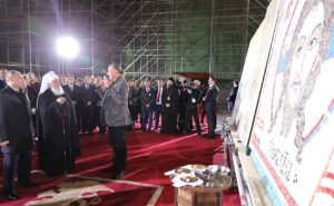 Фото: kremlin.ruС ходом работ по мозаичному оформлению купола и алтарной части собора президентов ознакомил руководитель группы российских мастеров, народный художник России Николай Мухин. Владимир Путин, Александр Вучич и Патриарх Сербский Ириней вложили недостающие фрагменты в мозаику «Образ Нерукотворный», символически завершив работу над панно.