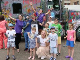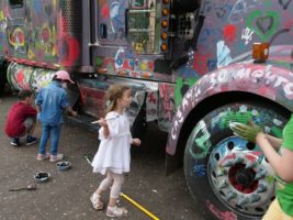 Подопечные реабилитационного центра «Русское поле» вместе с волонтерами разрисовали 9,5-тонную машину Kenworth яркими красками, оставили на ней отпечатки своих ладоней и написали добрые пожелания. 45-летний водитель сам перенес в детстве онкологическое заболевание — лимфогранулематоз.