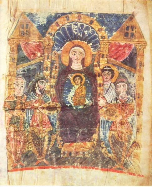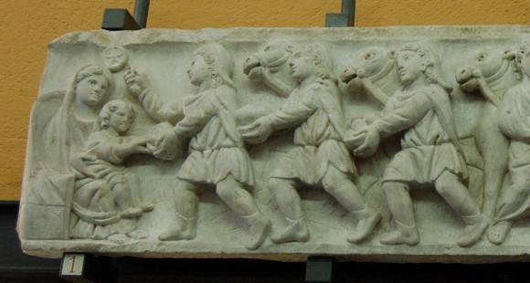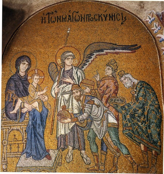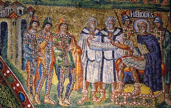 Симметричное решение избрали и мозаичисты, работавшие в базилике Санта Мария Маджоре. Волхвы в ярких, пышно украшенных одеждах изображены по сторонам от престола, на котором восседает Младенец.