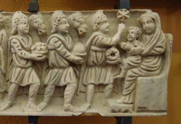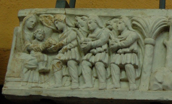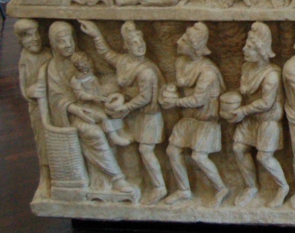Композиция «Поклонение волхвов» возникла под влиянием традиционного для античного искусства изображения поклонения побежденных варваров императору. На рельефах саркофагов Богоматерь с Младенцем на руках представлена в профиль. Позади Ее кресла, похожего на трон, часто изображается праведный Иосиф Обручник. Волхвы изображаются шествующими, шагающими. Первый из них обычно рукой указывает на звезду, стоящую над главой Младенца Христа.