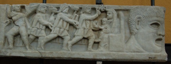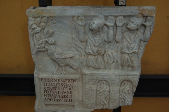 Очевидно, что первые христианские художники весьма свободно и широко использовали в творческом процессе наследие античного искусства. Иногда заимствовались даже языческие образы и отдельные персонажи, которые переосмысливались, получали новую трактовку. Использовались выработанные веками композиционные схемы, отдельные детали, декоративные мотивы. Например, рядом с Евангельским сюжетом могла помещаться декоративная маска или фигурки крылатых гениев, амуров.